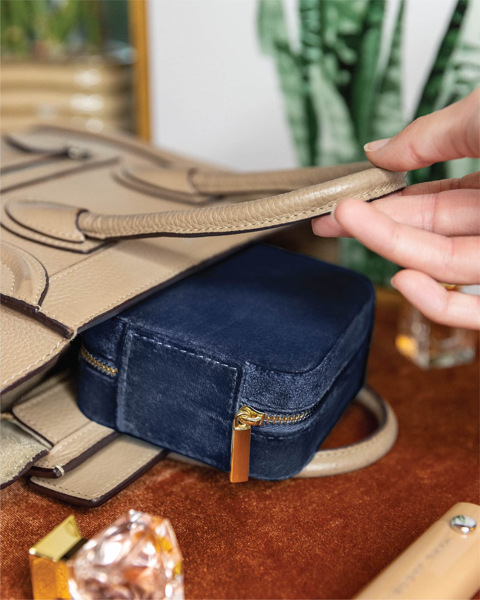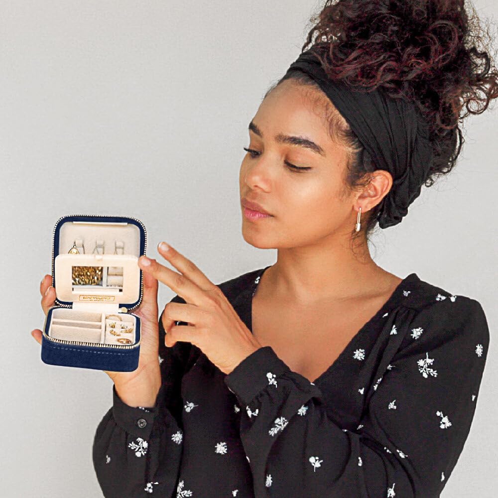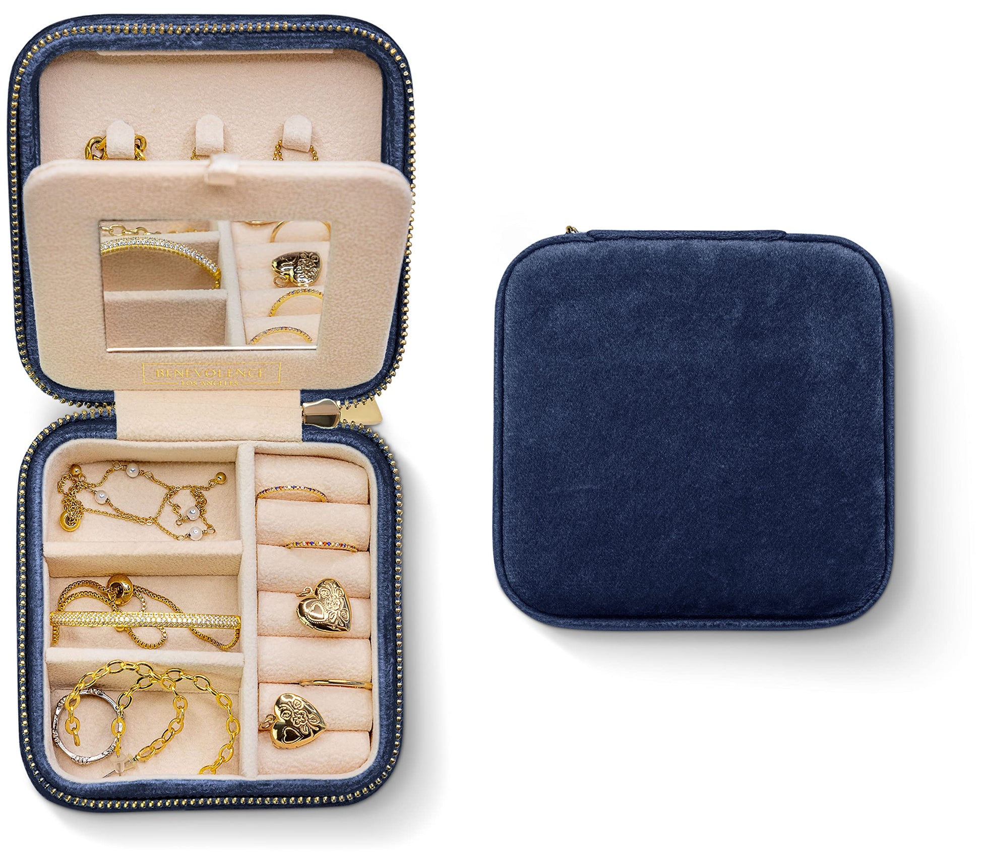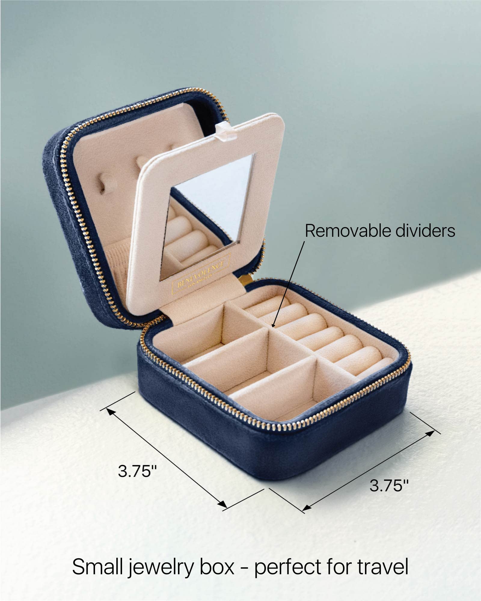 - LUXURIOUS VELVET FINISH: Designed in the USA, made from high-quality navy blue velvet material for a soft and luxurious feel, our jewelry case comes with a secret earring compartment and a built-in compact mirror. Completed with a gold-colored side zipper for a more classic and stylish look. Awesome travel accessories for women.