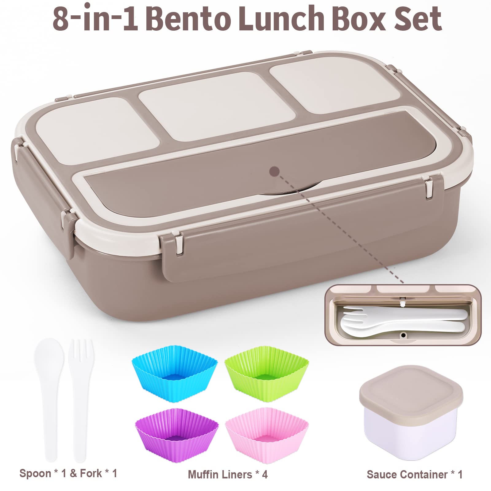 - 8-in-one: You will get 1 Brown Bento Box, 1 Spoon, 1 Fork, 1 plastic Sauce Jar and 4 silicone Muffin Liners. This bento box set can meet your needs for daily dining accessories