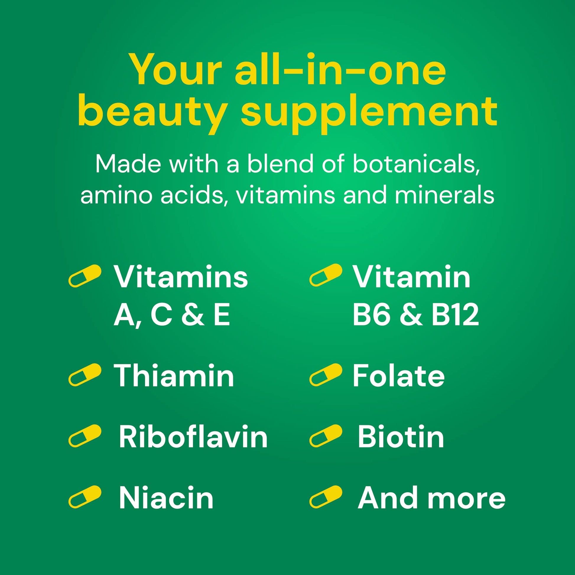 - Your all-in-one supplement for healthy hair, skin and nails; Formulated with botanicals, amino acids, vitamins and minerals including vitamin A, C, E, B6, B12, folate, calcium, zinc and more
