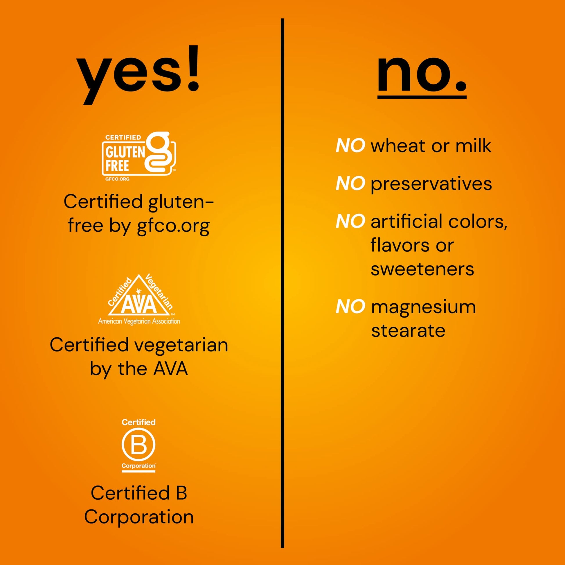 - Certified gluten-free and vegetarian; No wheat, milk, preservatives, artificial colors, flavors or sweeteners