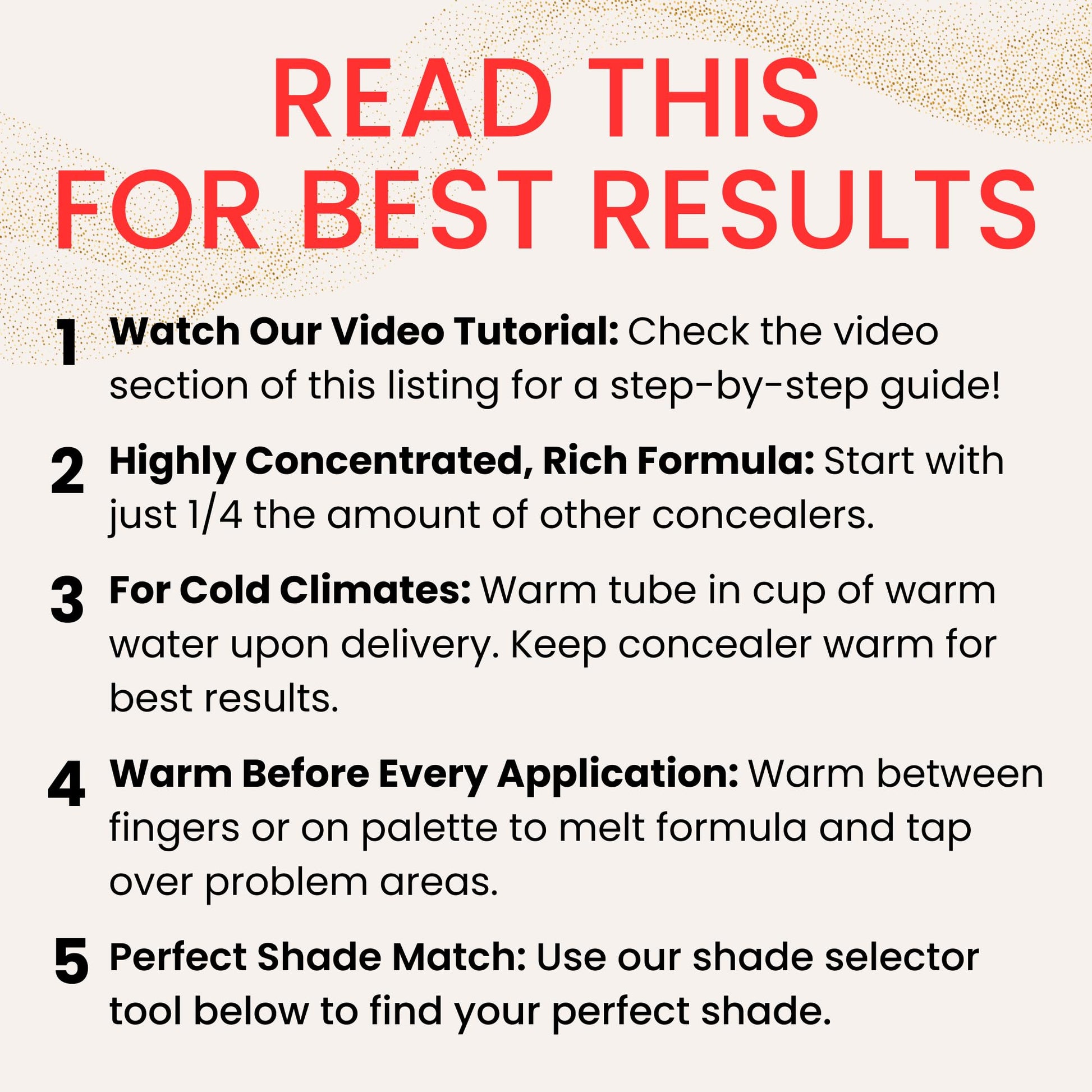 - Read This For Best Results: Use just 1/4 the amount of typical concealers; warm on fingers/palette until it melts for flawless application; find your perfect shade with our shade selector tool below; for cold climates to keep product warm before use; and check our video section for a detailed tutorial.
