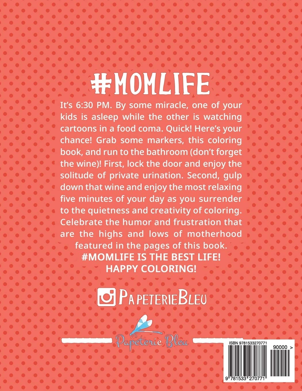 It's 6:30 PM. By some miracle, one of your kids is asleep while the other is watching cartoons in a food coma. Quick! Here's your chance! Grab some colored pencils and markers, this coloring book, and run to the bathroom (don't forget the wine)! First, lock the door and enjoy the solitude of private urination. Second, gulp down that wine and enjoy the most relaxing five minutes of your day as you surrender to the quietness and creativity of coloring. Celebrate the humor and frustration that are the highs and lows of motherhood featured in the pages of this book.