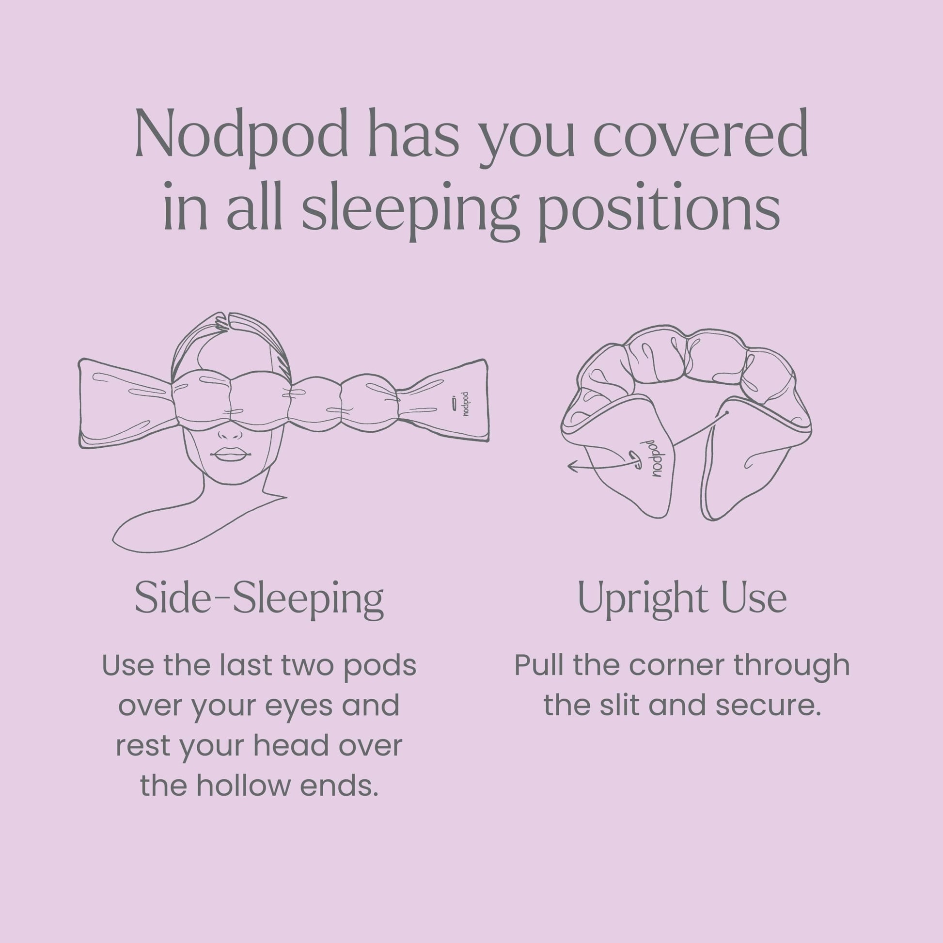 - Use The Way You Like: nodpod's pull-through strap design is adjustable and elastic free so it works in all positions - on your side, back, stomach, and even upright.