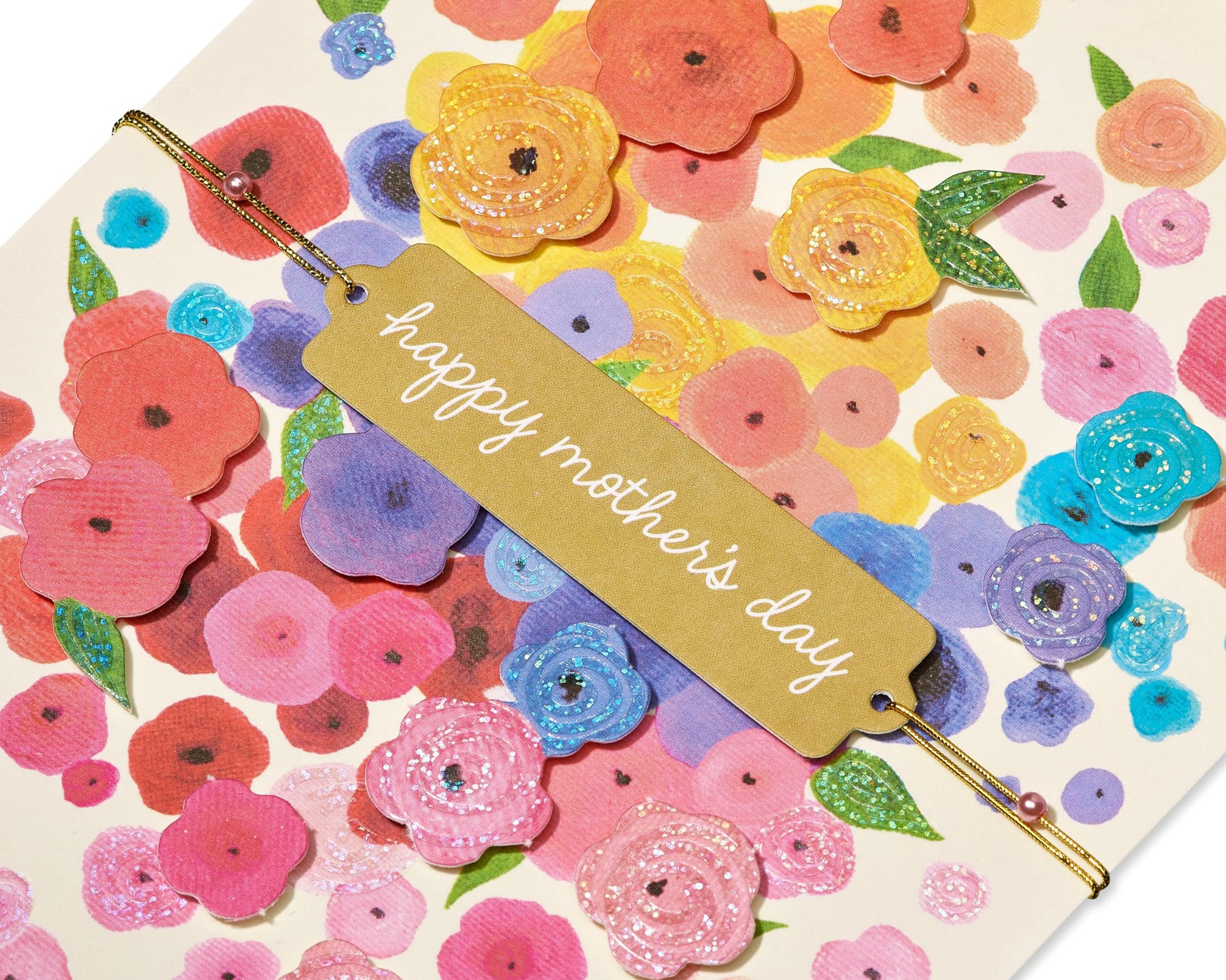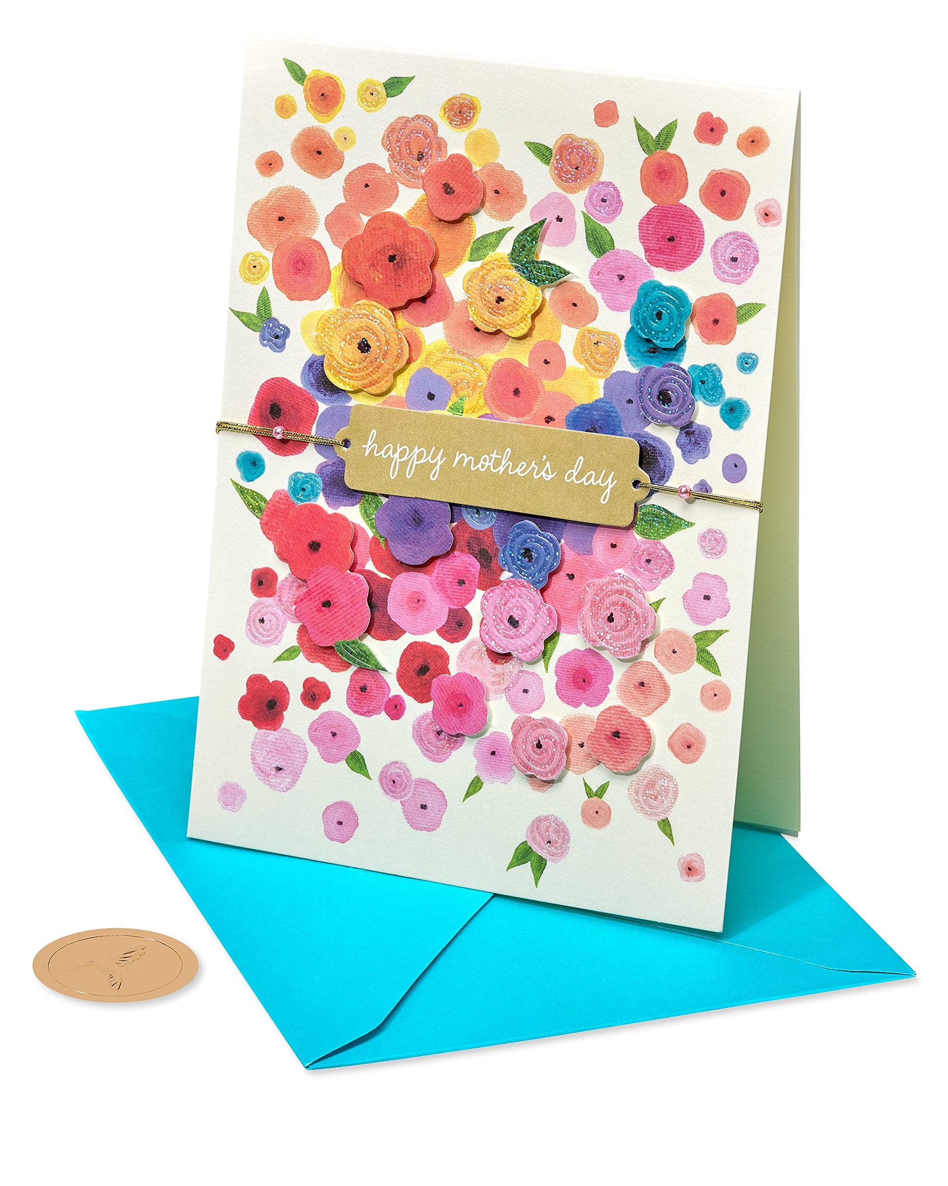 Details: A beautiful cascade of flowers creates a vibrant effect on this sweet Papyrus card for Mom. Layered handmade flowers accented with glitter and a text cartouche attached with gold cord and delicate pearl beads add unique touches to this Mother's Day card. This design with top fold is finished with an insert sheet with greeting and blossoms printed in full color. Comes with a coordinating pink envelope with bright orange liner, gold Papyrus hummingbird seal and a protective cello sleeve. Papyrus offers premium stationery, greetings cards, gift wrap, gift bags and entertaining products for everyday occasions and all holiday seasons-all with unique designs and quality embellishments.